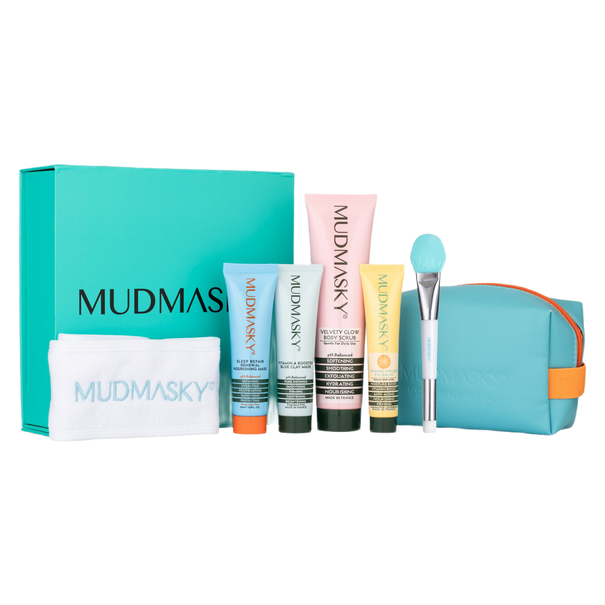 Packaged in a signature MUDMASKY gift box with a vegan leather pouch. This set includes our bestsellers for face, eyes, body, and hair, plus a spa headband and mask brush for the ultimate at-home ritual.